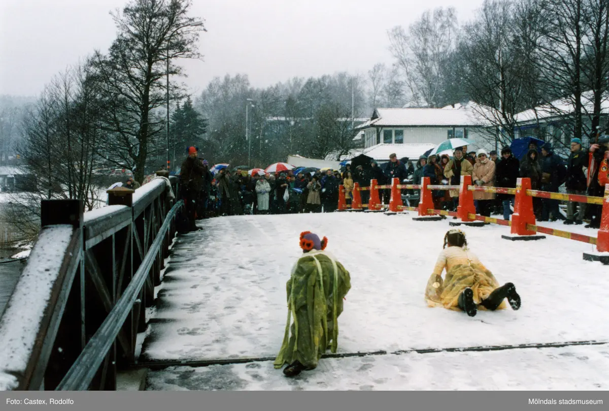 Dansuppvisning vid invigningen av Gunnebo Bro vid Stensjön. Mölndal i mars 1999.