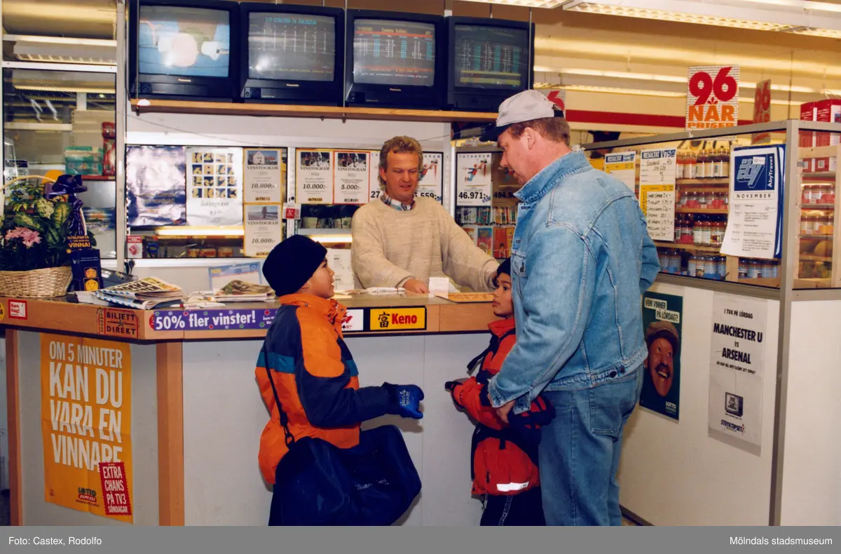 Tips- och spelavdelningen på Pepparns livs, Peppareds torg 2, i Östra Balltorp, Mölndal, 13-14 november 1996. Kjell Samuelsson, bakom disken, har tre kunder i butiken.