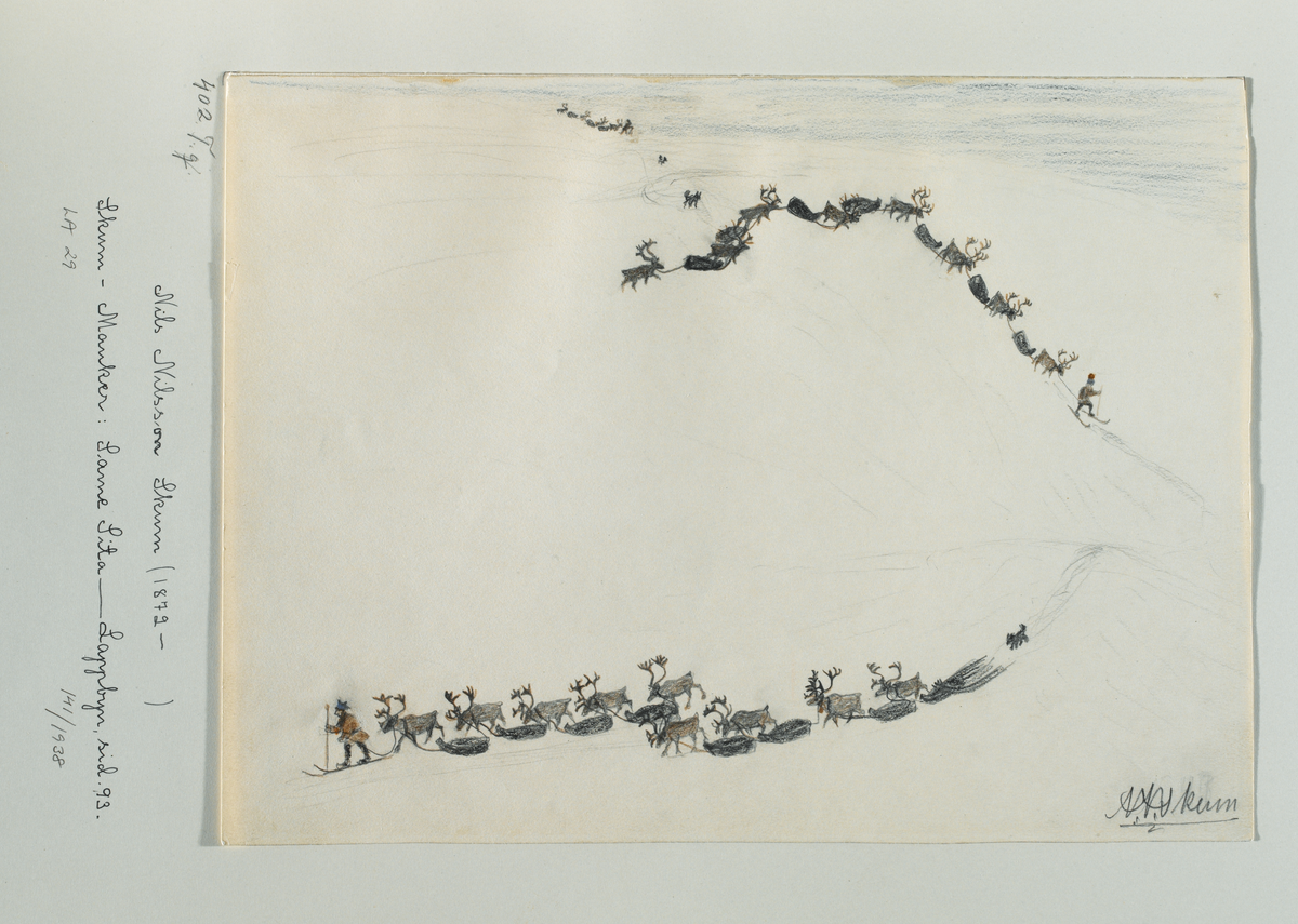 Teckning av Nils Nilsson Skum, troligen utförd mellan 1930 och 1938. Samer och renar med ackjor, raiden på väg från höstvistet ned mot skogslandet.