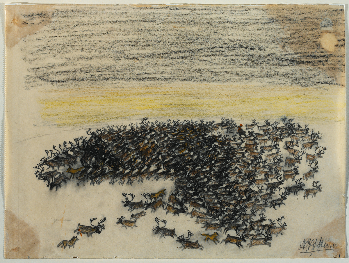 Teckning av Nils Nilsson Skum, troligen utförd mellan 1930 och 1938. Varg i renhjord.