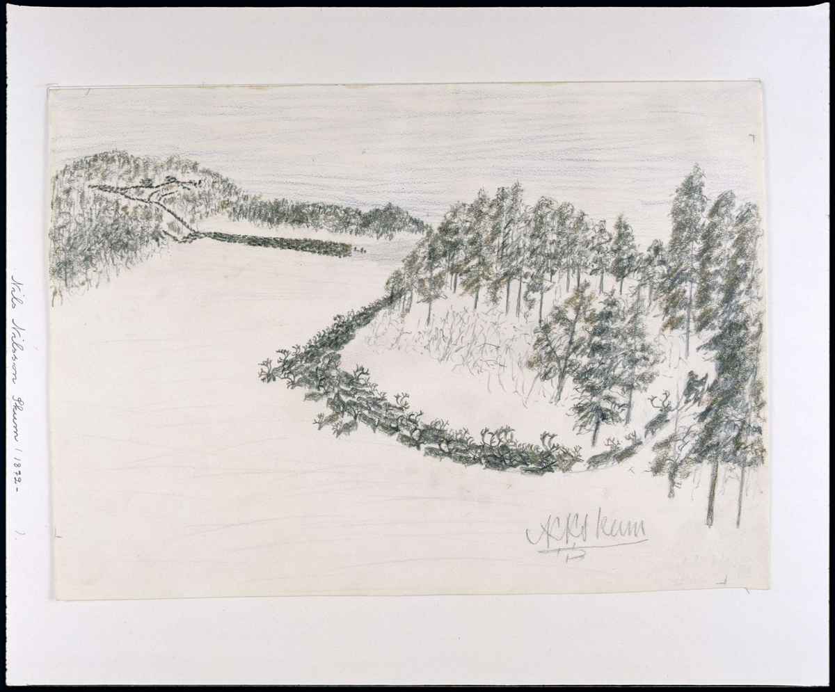 Renhjord flyttas genom fjällskog. Teckning i krita av Nils Nilsson Skum, troligen utförd mellan 1930 och 1938.