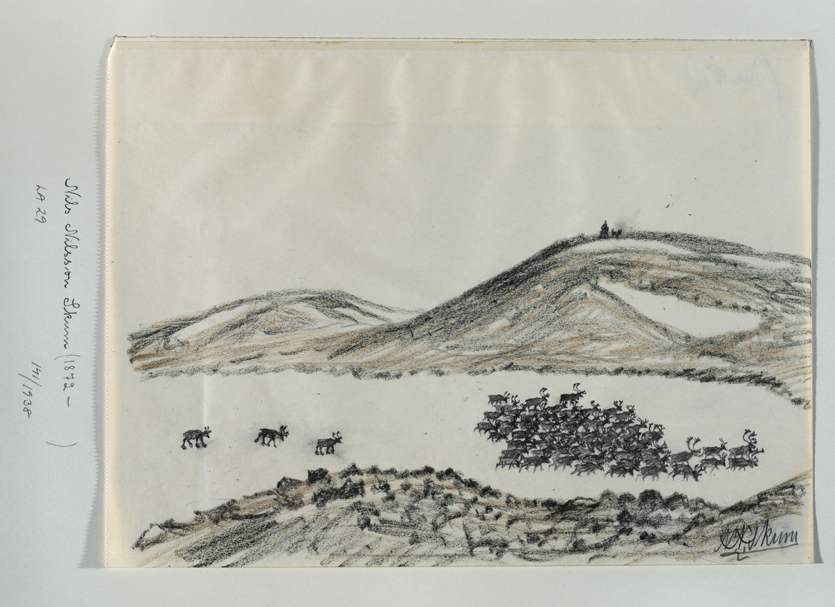 Teckning av Nils Nilsson Skum. Renar i fjällandskap. På en höjd står renskötaren och hans hund och ser ner över hjorden.