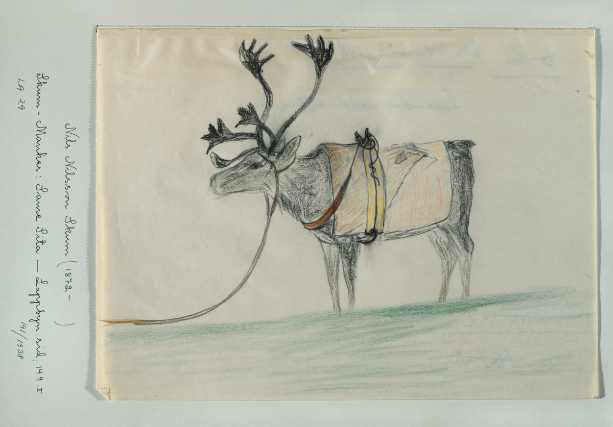 Titel: Teckning av Nils Nilsson Skum, troligen utförd mellan 1930 och 1938. Ren med klövjesadel.