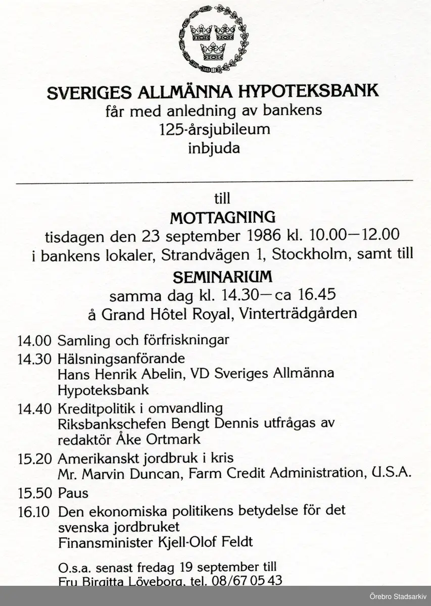 Programblad till Sveriges allmänna hypoteksbank 125 år, 1986-09-23