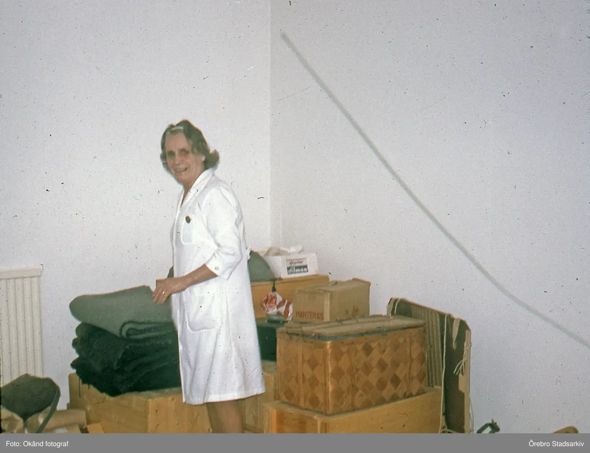 Packning av kläder och filtar inför Röda korsets hjälpsändning från Asker, 1970