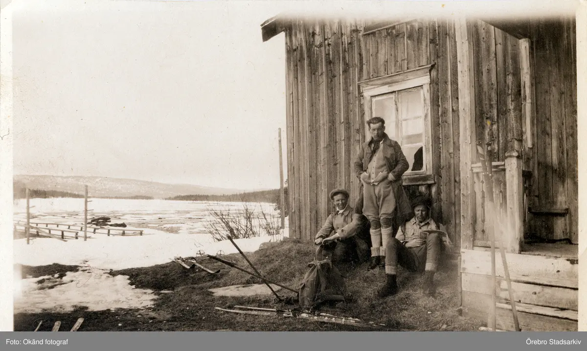 Tre fjällturister vid raststuga i Norrland, 1912