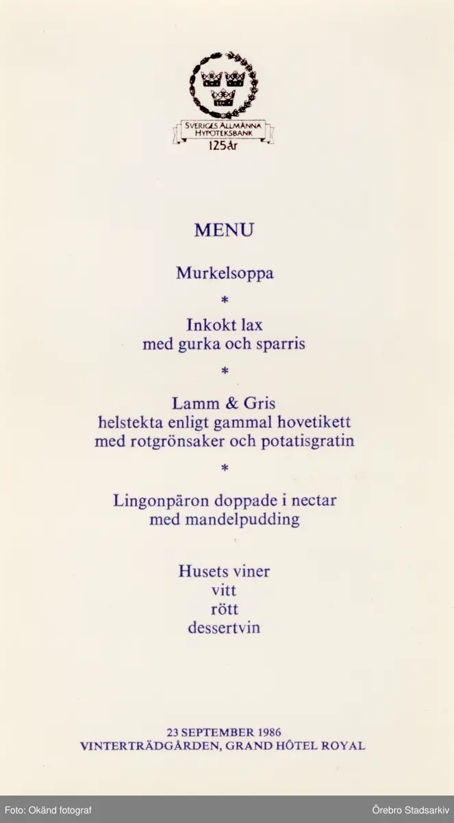 Meny till Jubiléumsbankett ¨Anno 1861¨, 1986-09-23