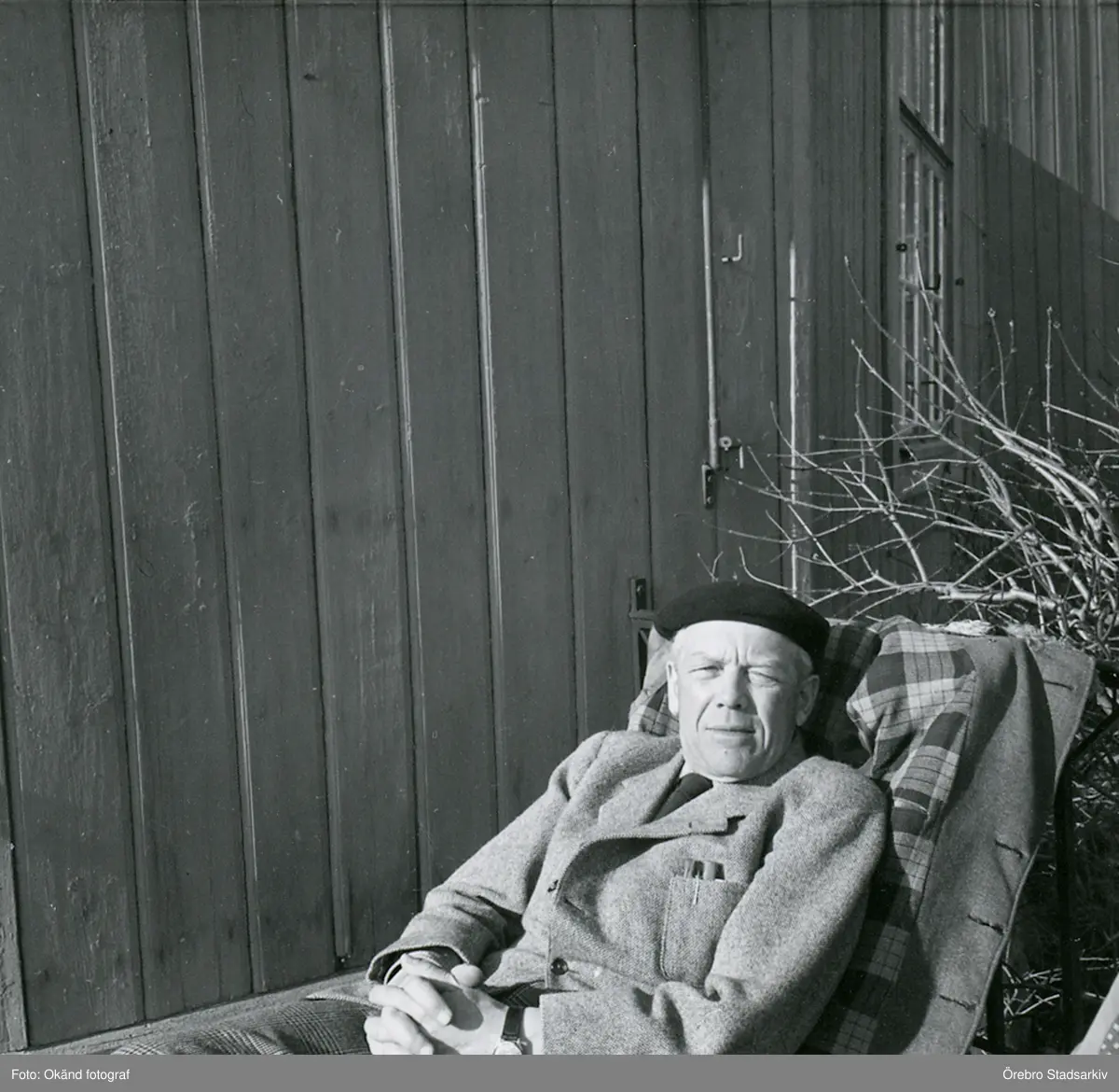 Carl Gripenstedt sitter i vårsolen på Brevens herrgård, 1955