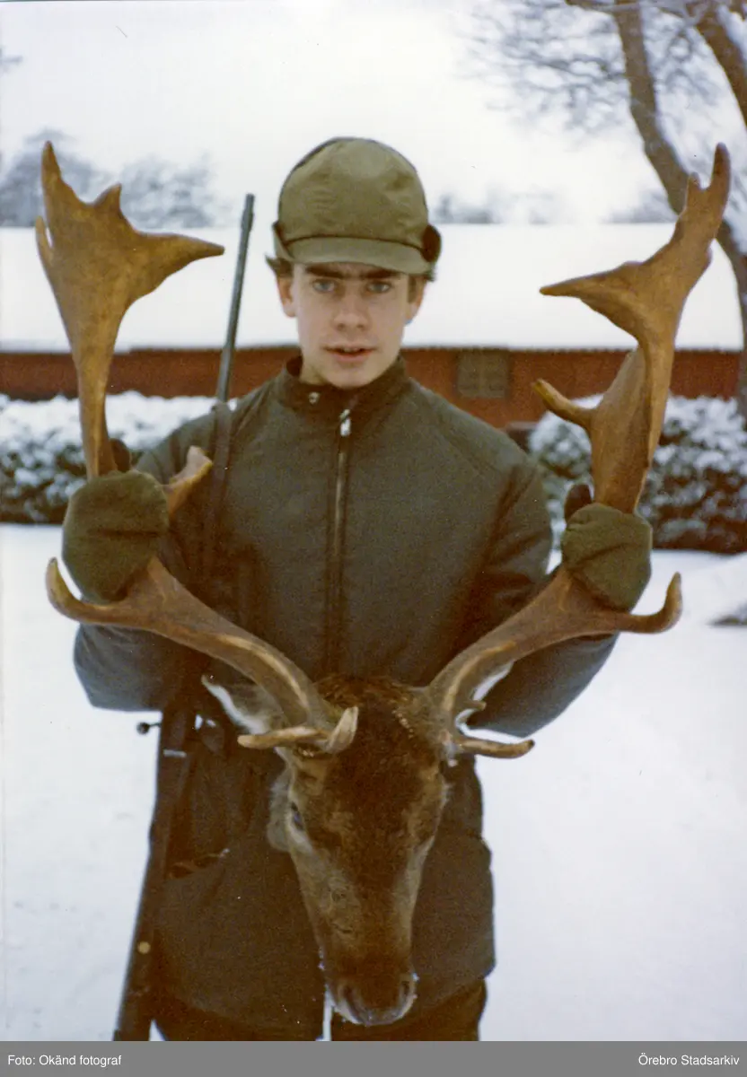 Jakttrofé visas upp efter älgjakt i Asker, 1979
