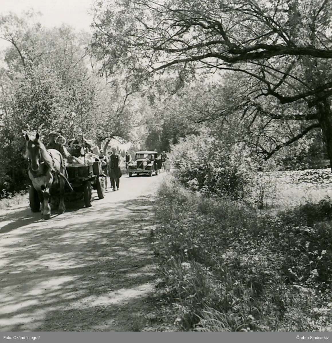 Skogisstudenter med häst och vagn följs av bil, 1946
