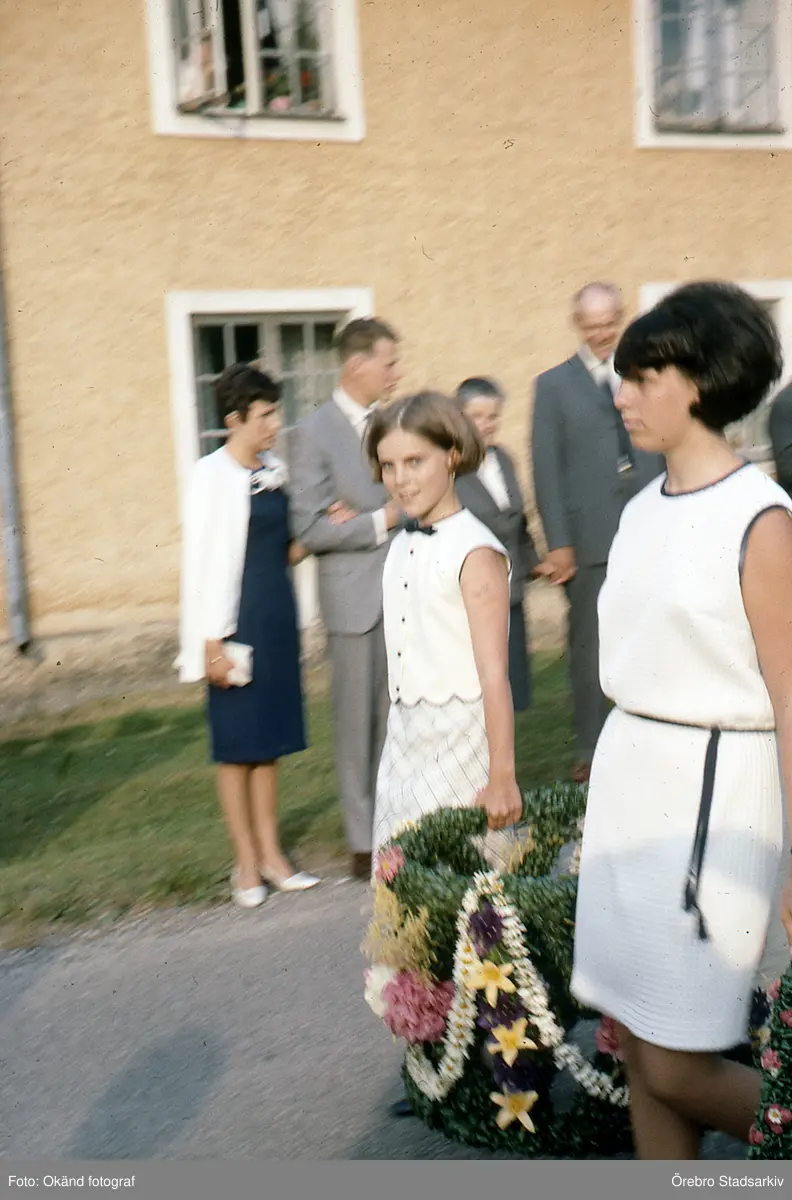 Flicor bär krans till midsommarstång, ca 1967
