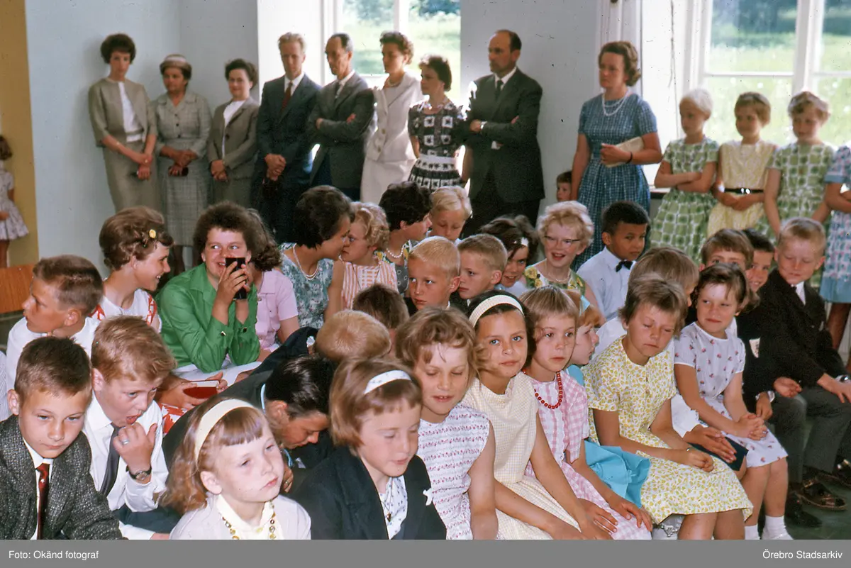 Barn och föräldrar på skolavslutning i Brevens bruk, 1963