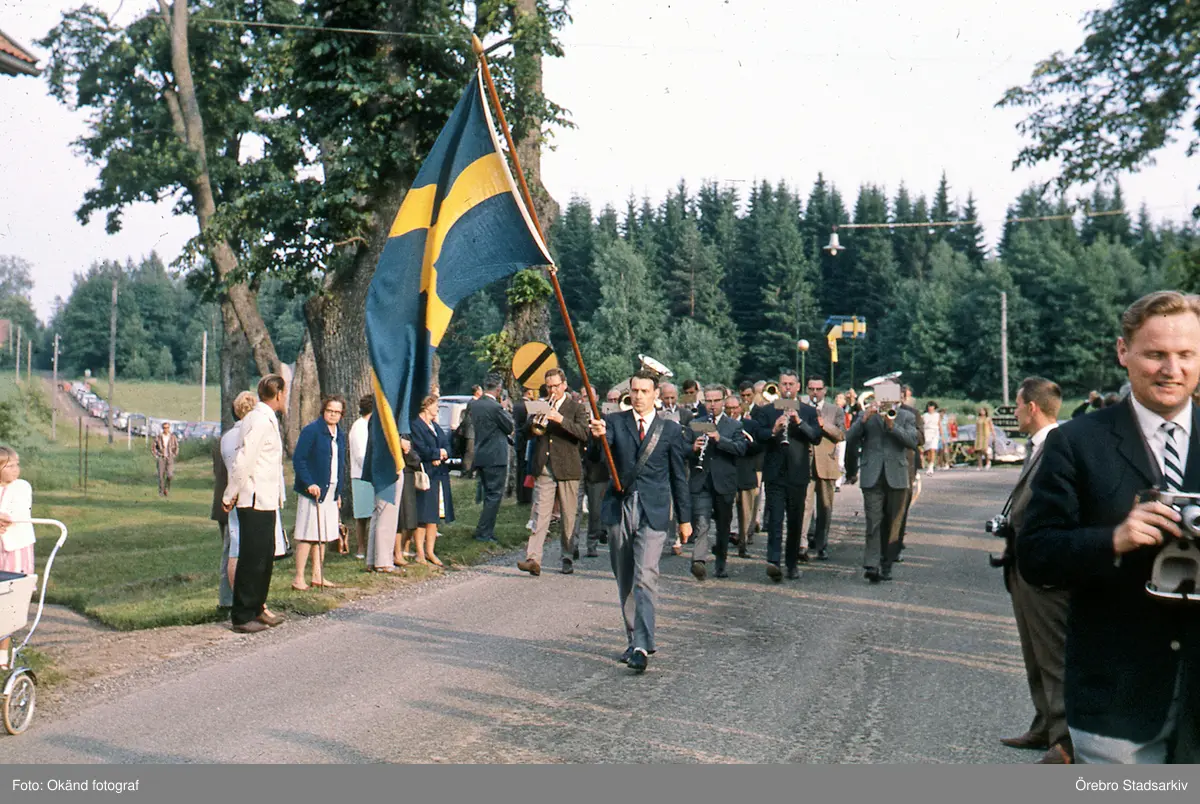 Brevens hornmusikkår följer flaggbäraren, ca 1967