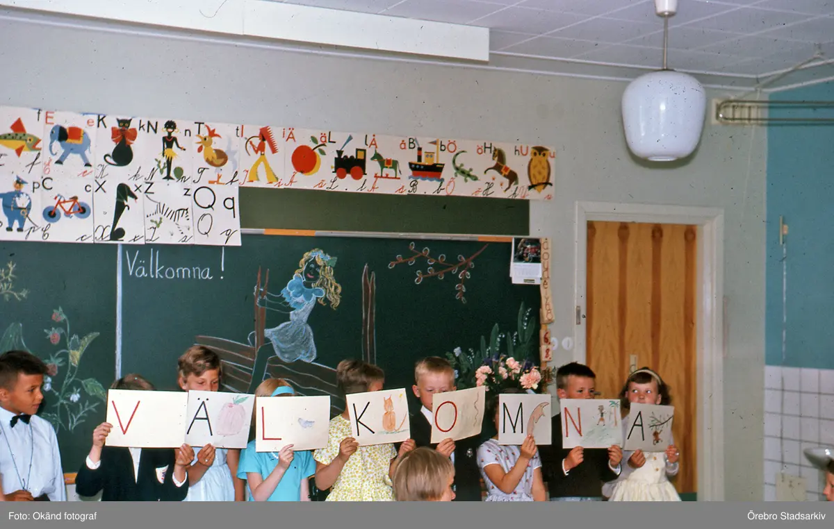 Elever håller upp bokstäver "Välkomna" på läsårsavslutning i Brevens skola, 1963