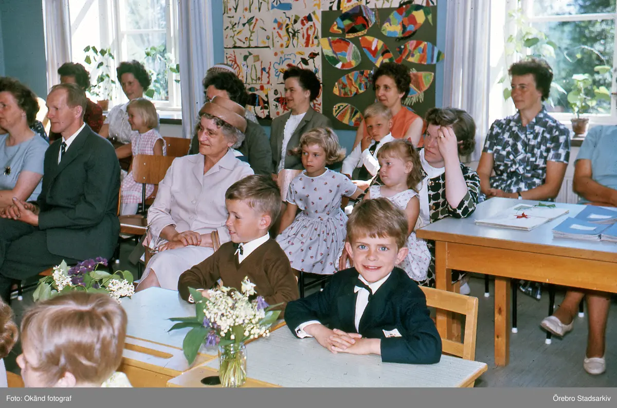 Föräldrar och barn på skolavslutning i Brevens bruks skola, 1963