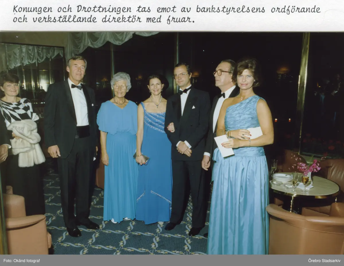 Kungen och Drottningen tas emot av bankstyrelsens ordförande och verkställande direktör med fruar, 1986-09-23