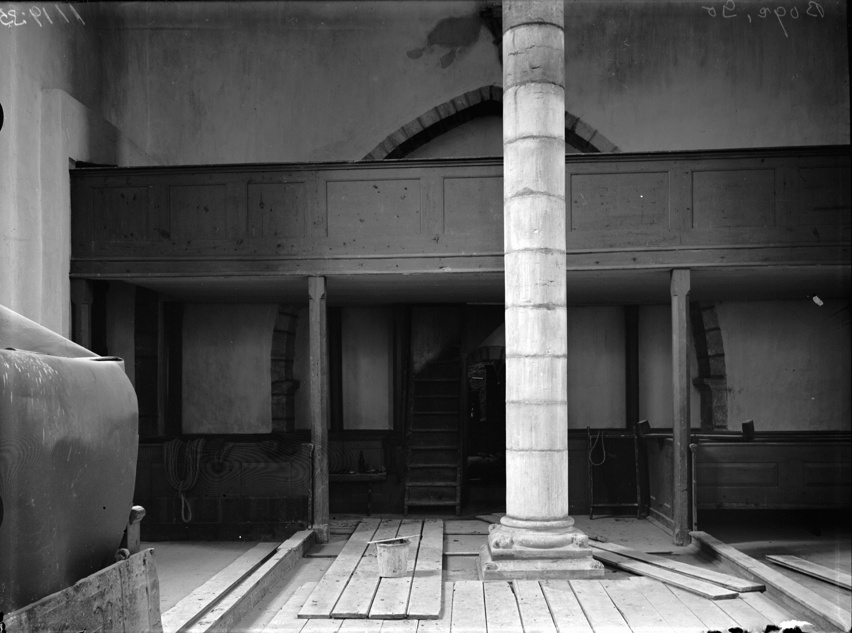 Läktaren före borttagandet och den nyuppsatta pelaren.