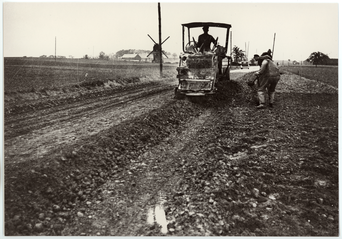 Spridning av makadam, inför betongbeläggningsarbetet.