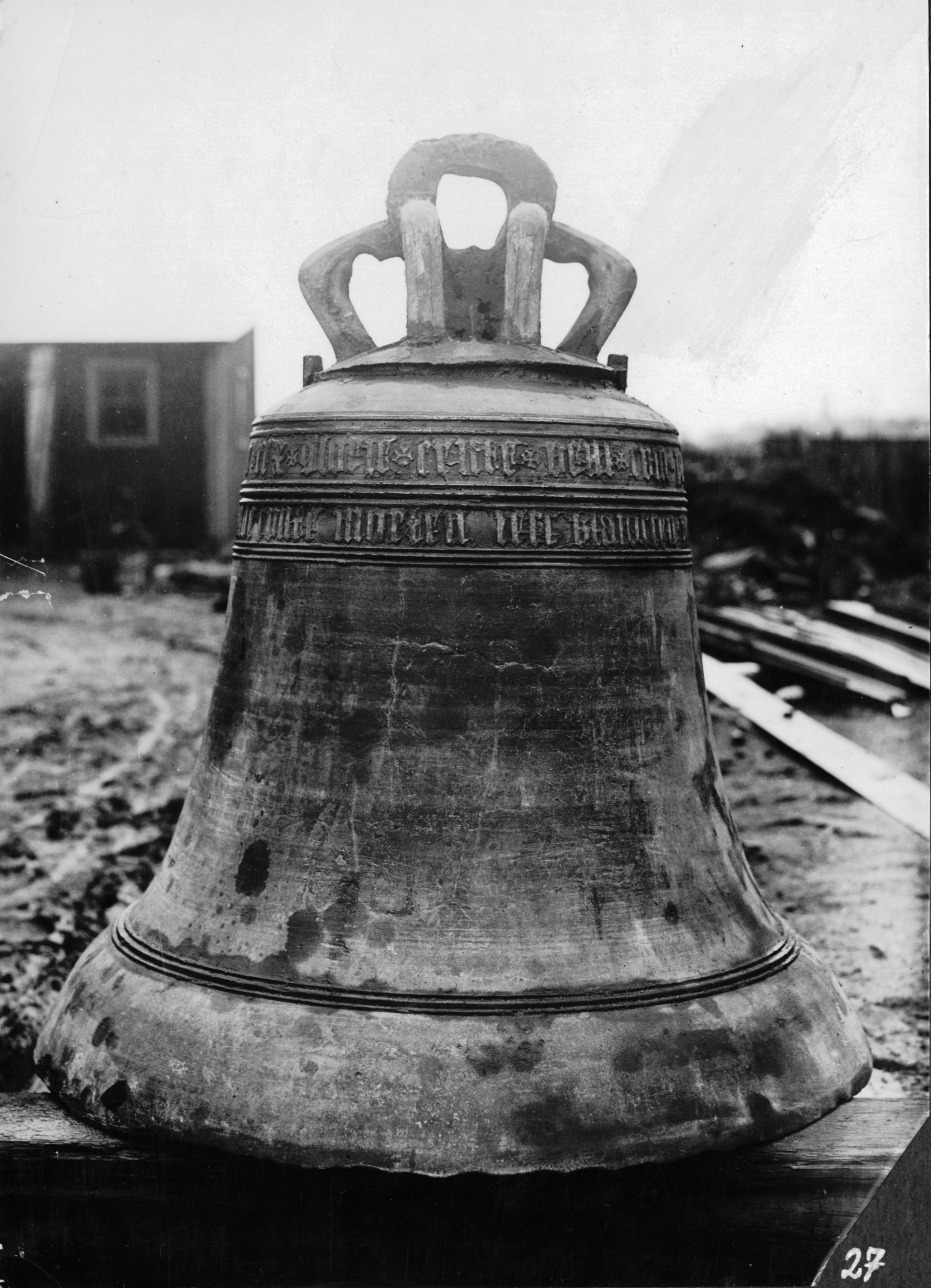 Klocka av malm, dubbla skriftband. Gjuten av M. & O. Olssons klockgjuteri, Ystad.