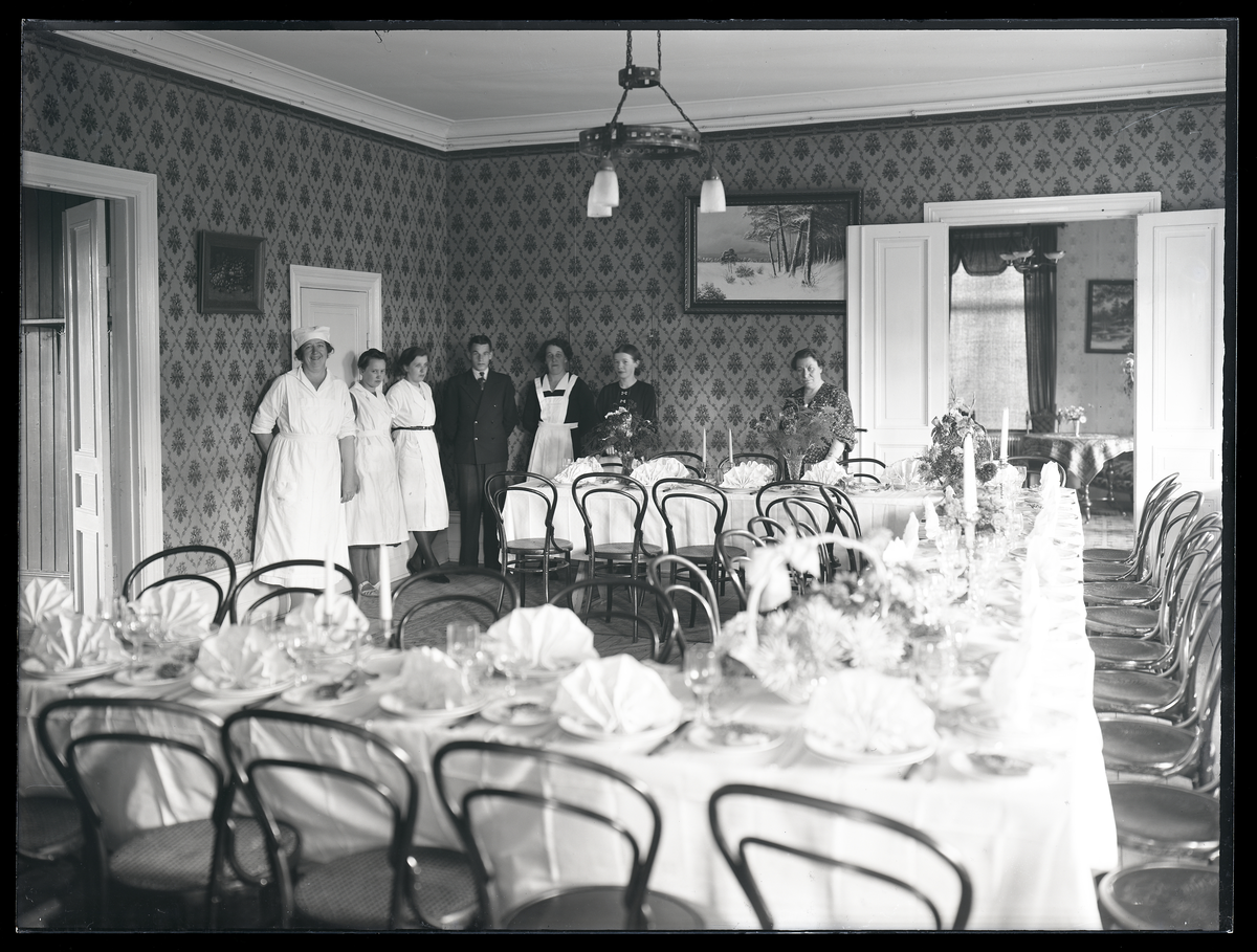 Grupporträtt. Dukat bord och personal, Hotellet, Kolbäck.