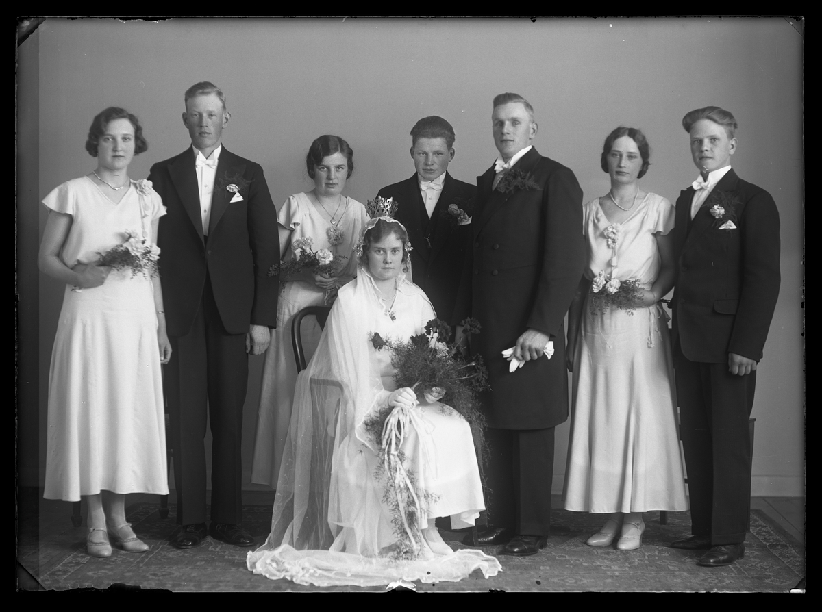 Grupporträtt, åtta personer, bröllop. Knut Eriksson, Yttersörby, Munktorp.
