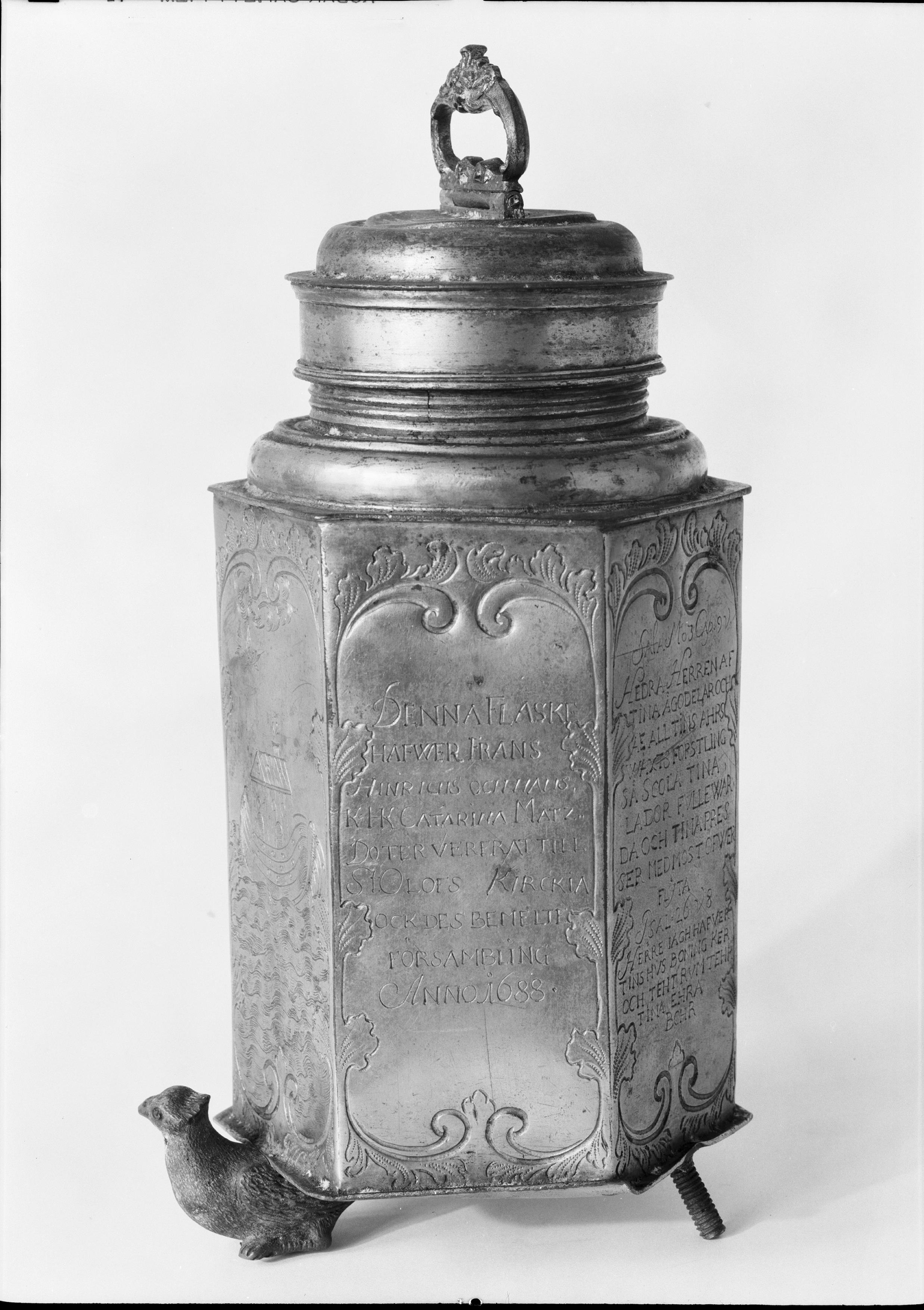 Vinbehållare, vinflaska av förgylld mässing från 1688.