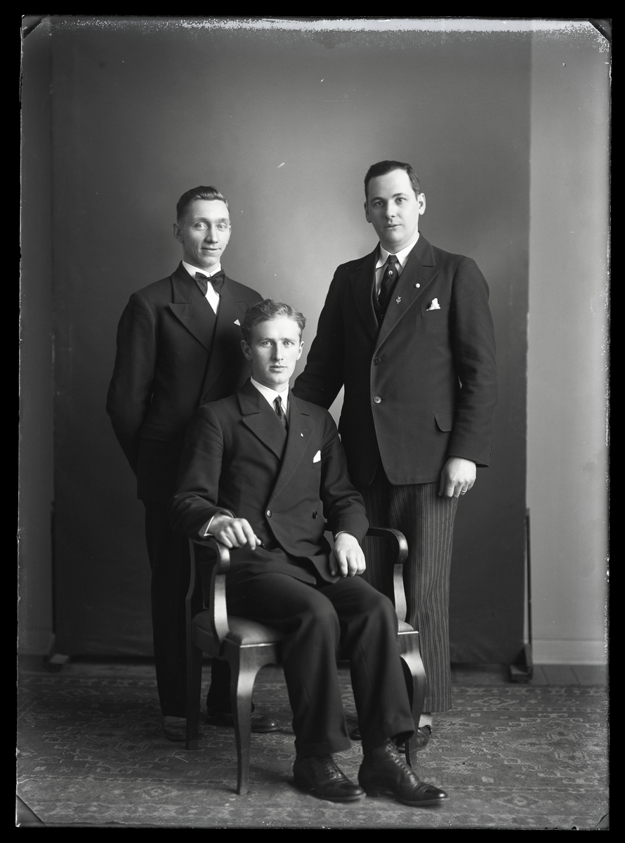 Grupporträtt, tre män. Isidor Larsson, Sörstafors, Kolbäck.