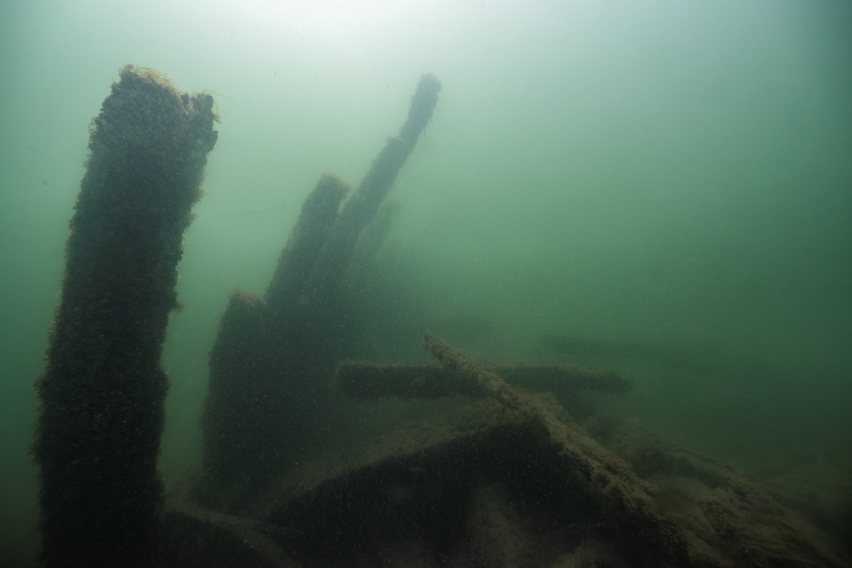 Spanten/topptimren syns sticka upp med en tydlig kurvatur.