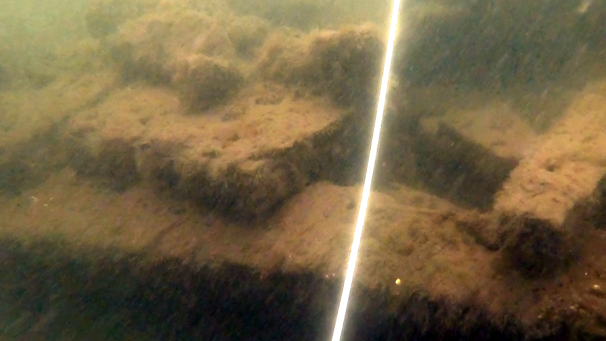 Kraftiga däcksbalkar syns under delar av däcket som är delvis täckt med sten.