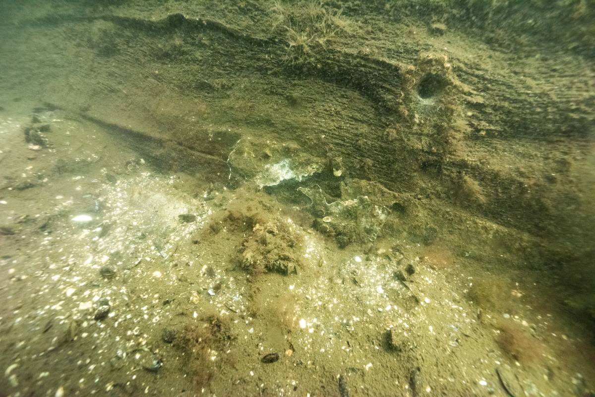 Lagning synlig strax akter om urtaget. Den vita korrosionen talar för att det är en blyplåt