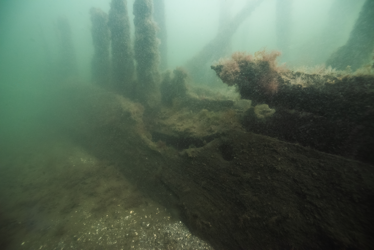 Bilden visar babordssidan och ett av de mycket breda borden på ett av vraken. Det runda urtaget har oklart syfte.