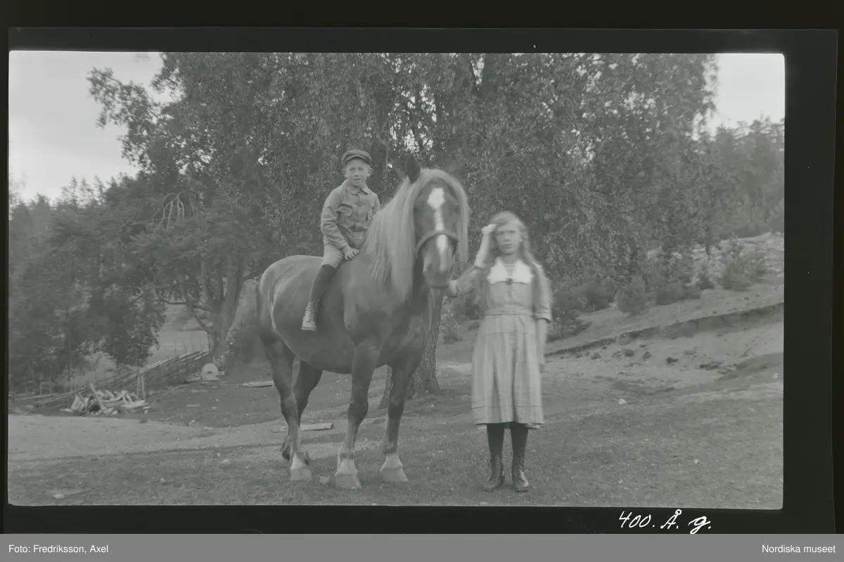 En pojke sitter på en häst i en hage. En flicka håller hästen.