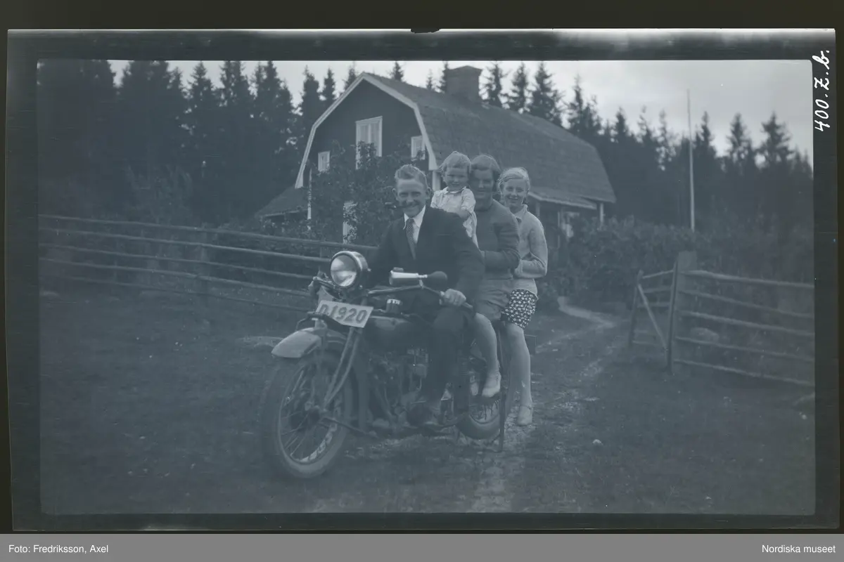 En ung man med pipa i mungipan skjutsar två flickor och ett litet barn på en moped/ motorcykel.