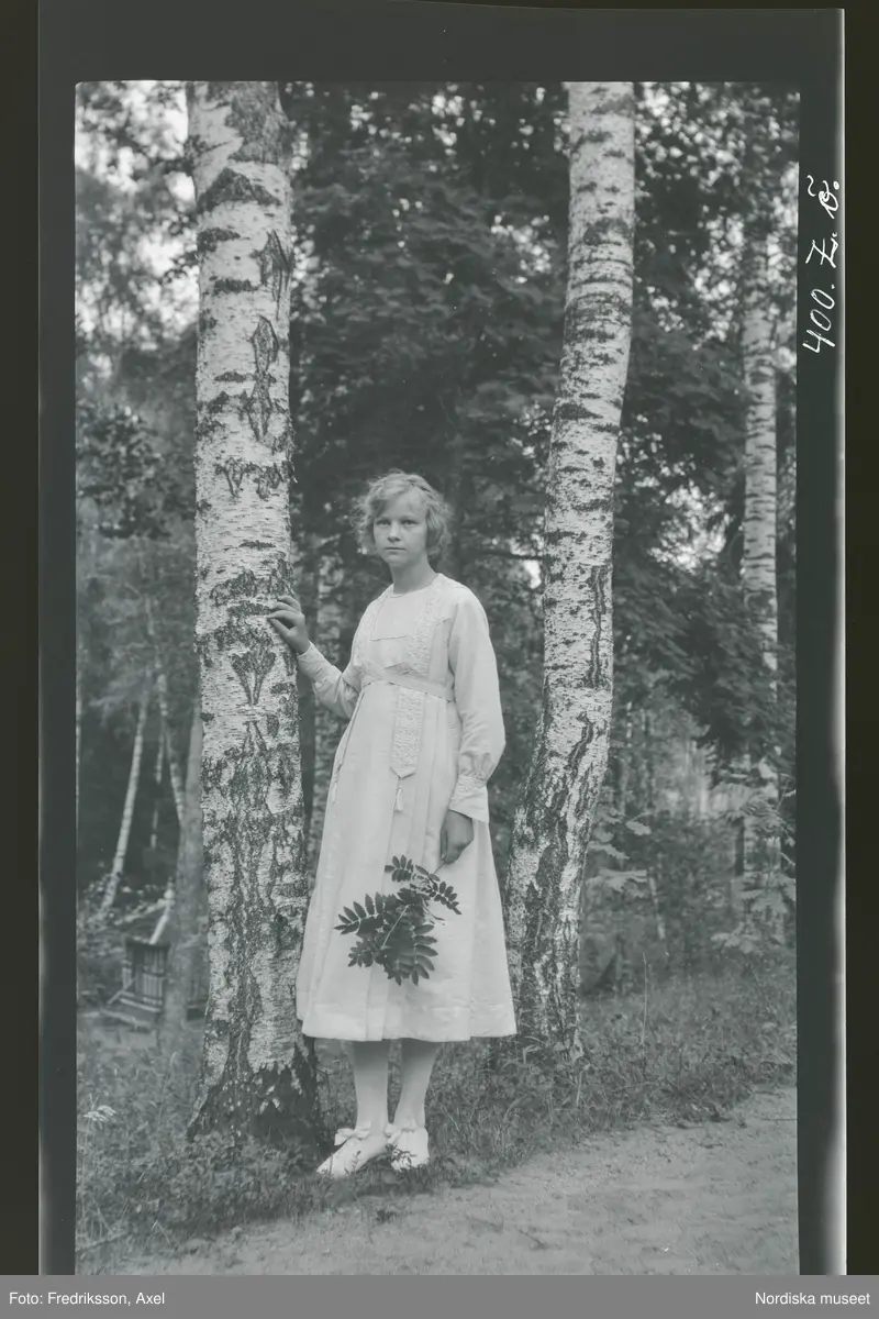 En ung kvinna klädd i vitt ståendes vid en björk. Hon håller en kvist med blad i ena handen.