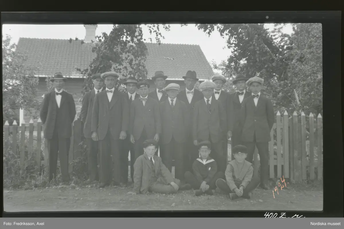 Grupporträtt av ett sällskap unga män och pojkar, ståendes och sittandes utomhus.