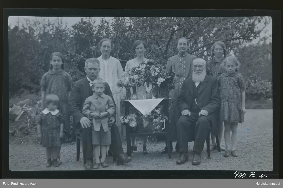 Grupporträtt taget utomhus. På ett bord i mitten står vaser med blommor.