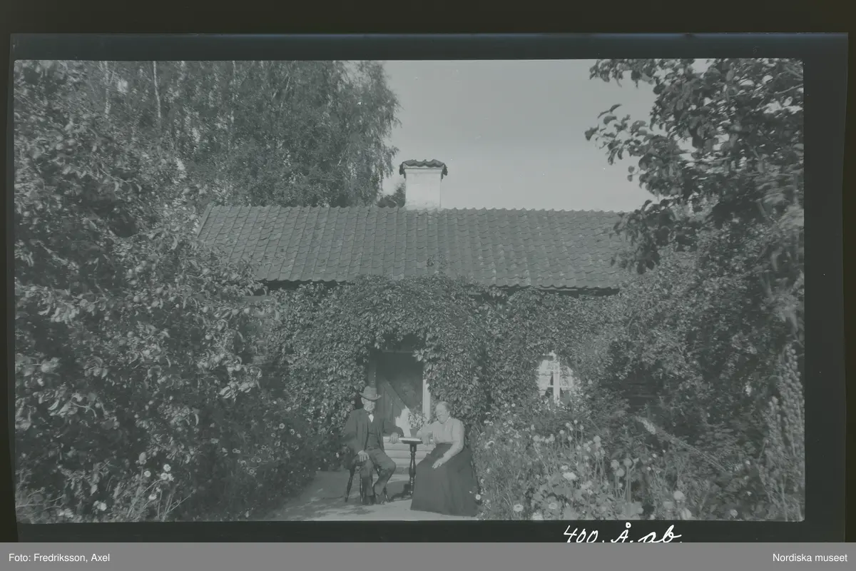 En man och en kvinna sitter i trädgården framför ett hus. Fasaden är täckt av växlighet.