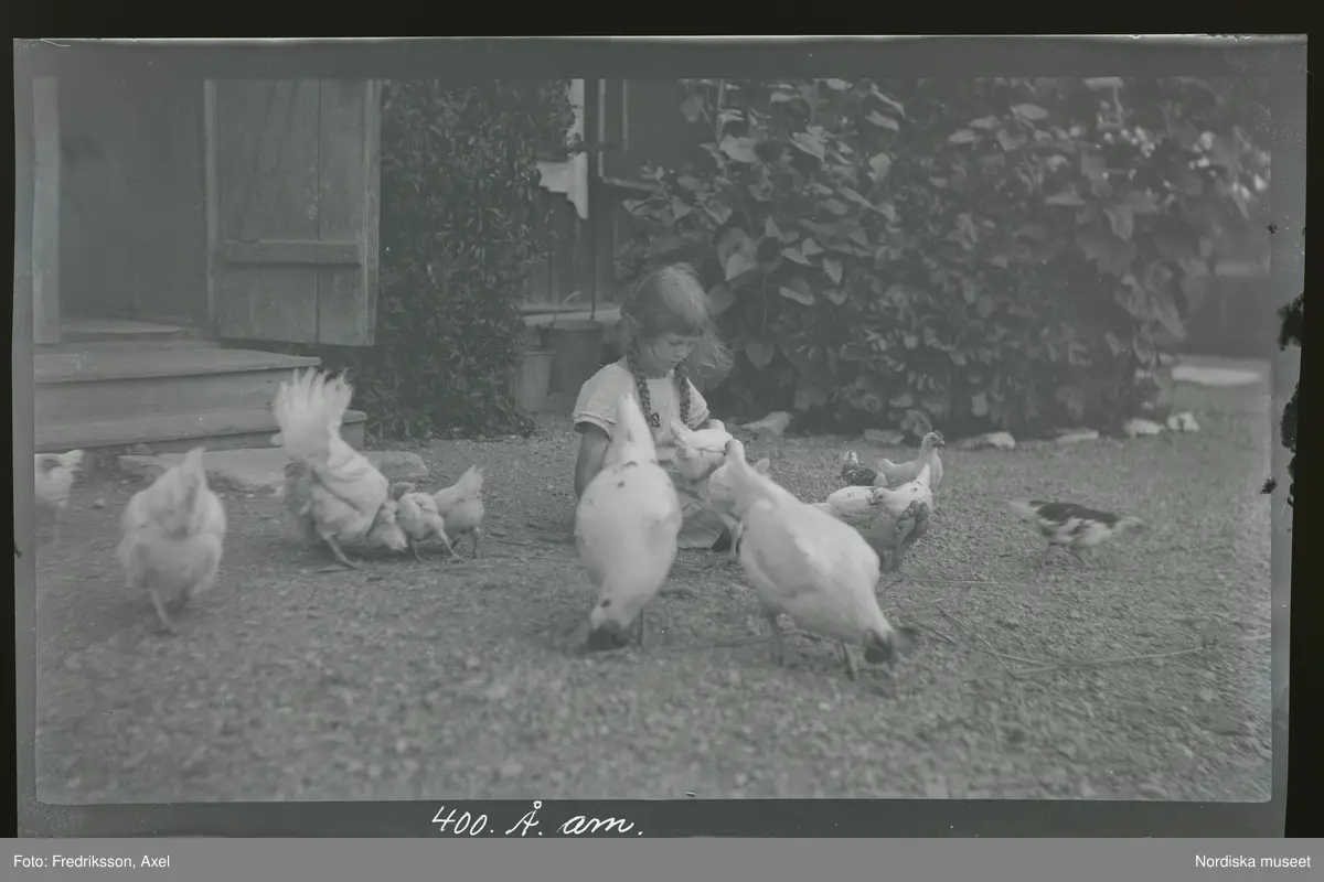 En flicka, fotografens dotter, sitter på en gårdsplan omgiven av höns och kycklingar.