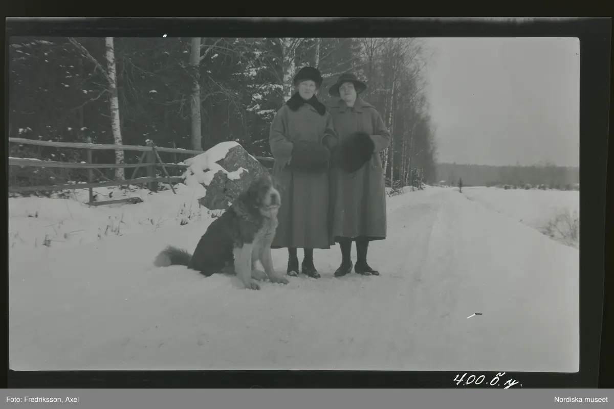 Två kvinnor porträtterade ute på en snöig landsväg tillsammans med en hund.