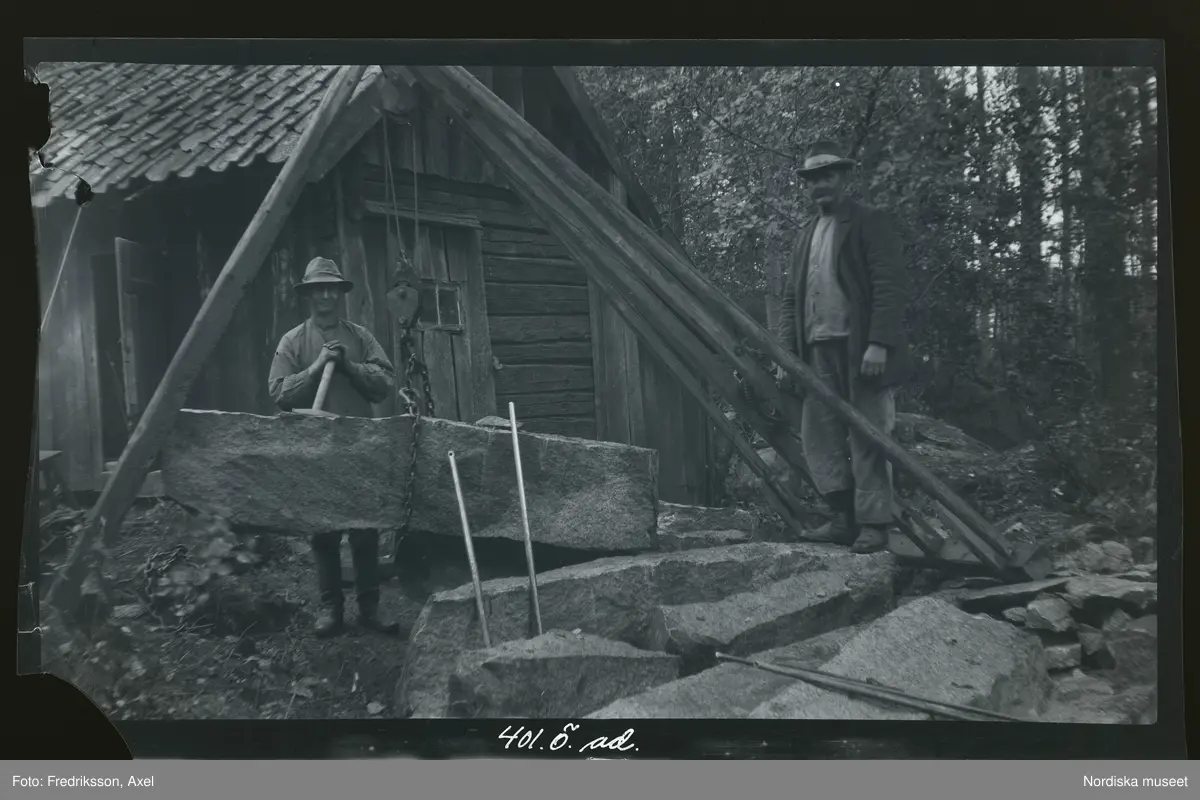 "Axel, far och bror Ivar kilar ut sten till husbygge."