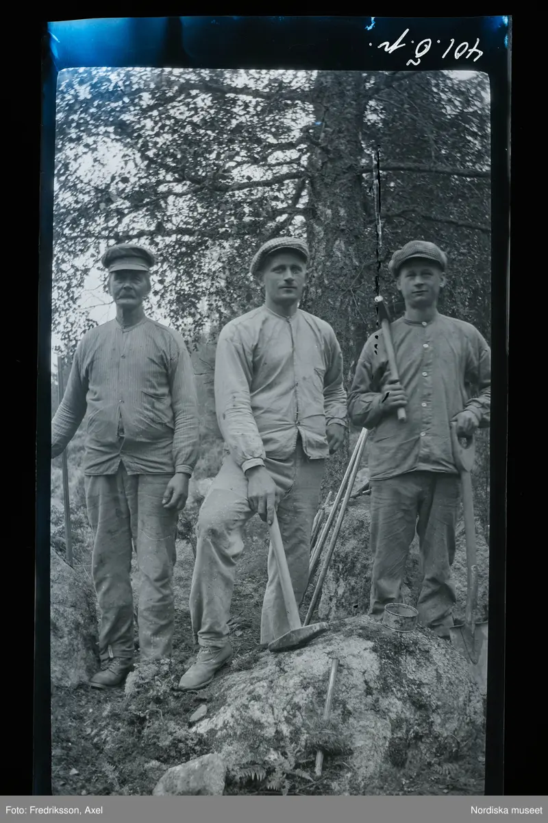 Porträtt av tre män med släggor. Fredrik Vilhelm Eriksson till vänster, Axel Fredriksson i mitten.