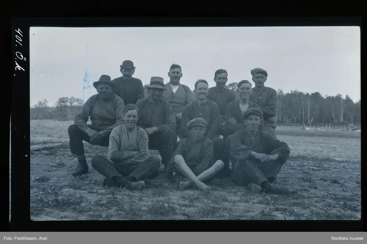 "Arbetslag, sågen Fogelstad. Mannen tredje fr.v. i mittersta raden är Gustav Larsson, Farmartorp, riksdagsman."