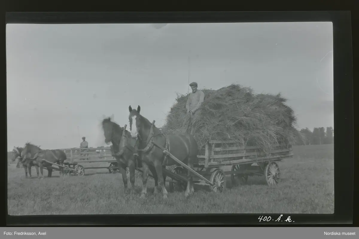 En man kör lutad mot ett hölass på en vagn dragen av två hästar.