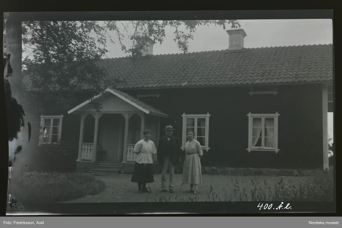 En man och två kvinnor står på gårdsplanen framför ett hus.