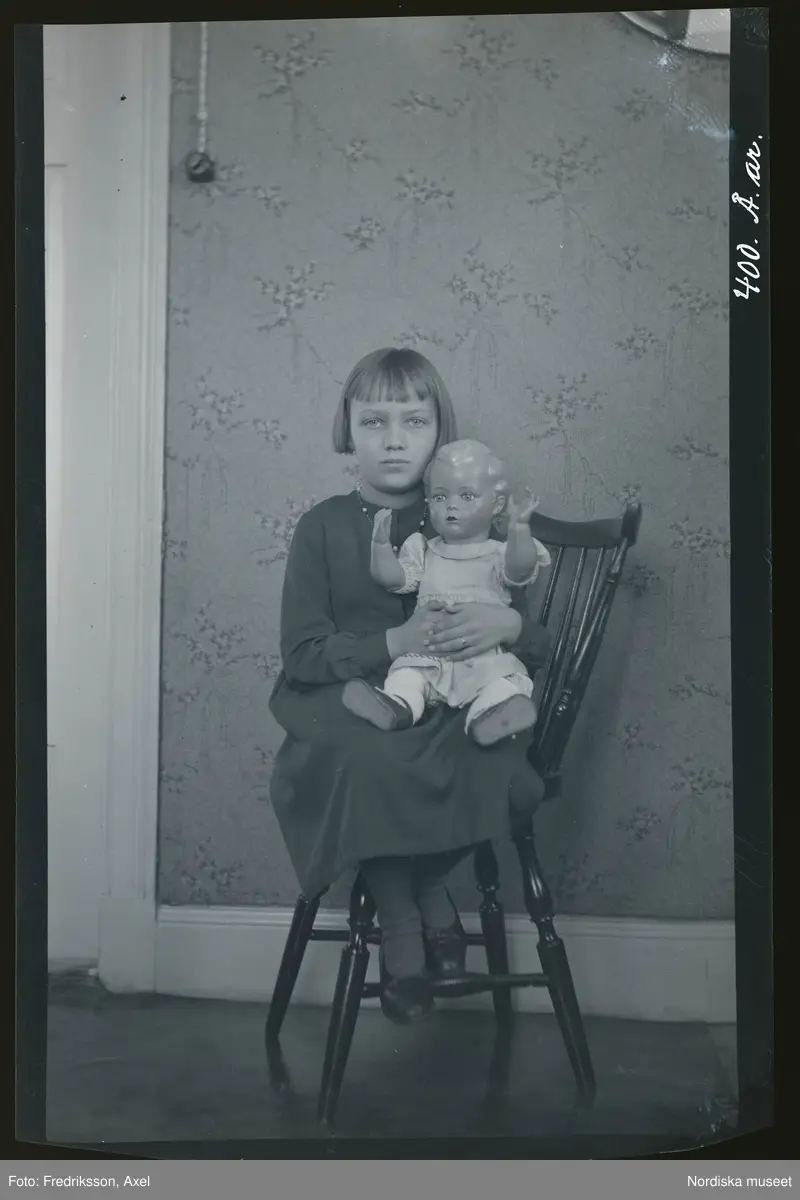 Porträtt av en flicka sittandes inomhus på en stol med en docka i famnen.