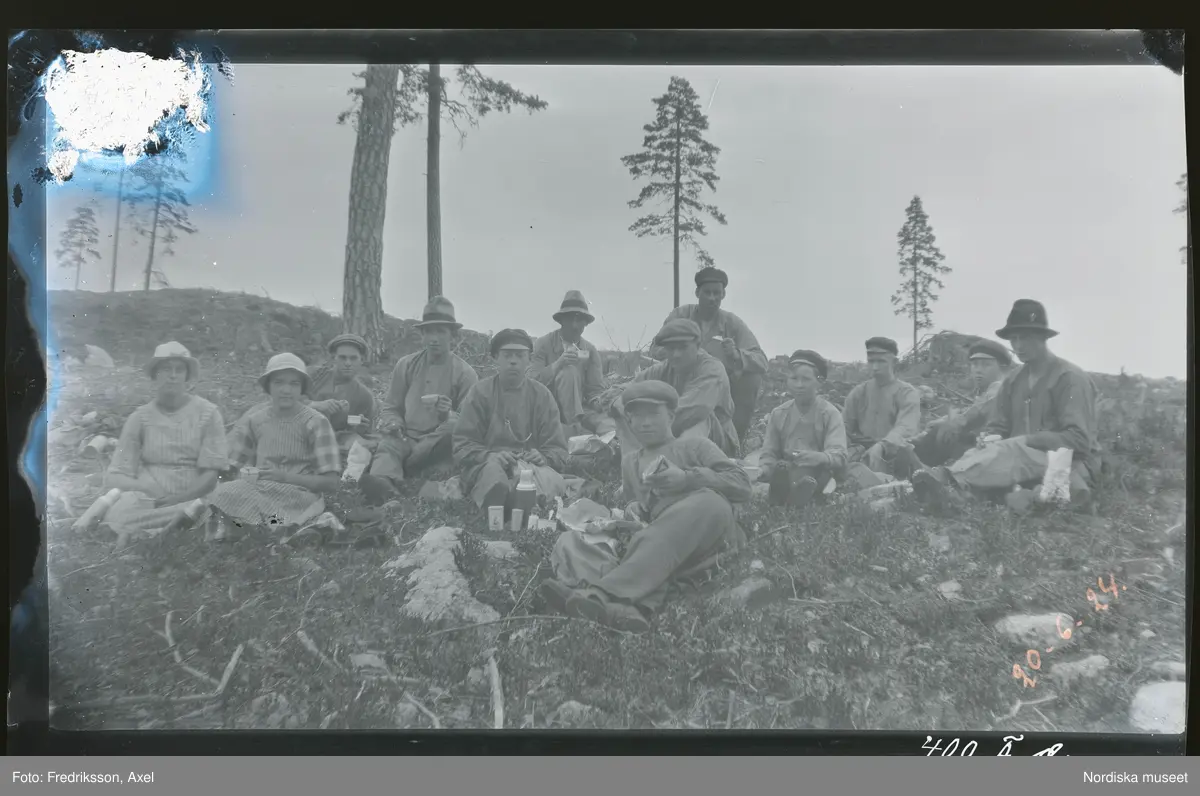 "Middagarast, skogsplantering Fogelstad foto 1926 Från vänster: Hildur Pettersson i Atorp, Ebba Ohlsson i Fogelstad, Evert Sundberg Fogelstad, Hugo Johansson Mo, skogvaktare Oström, Axel, övriga okända /A-LE. "