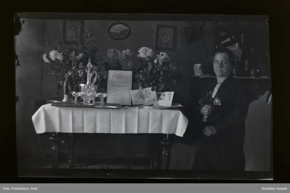 En kvinna sitter vid ett bord med telegram, gratulations-kort och blommor i vaser.