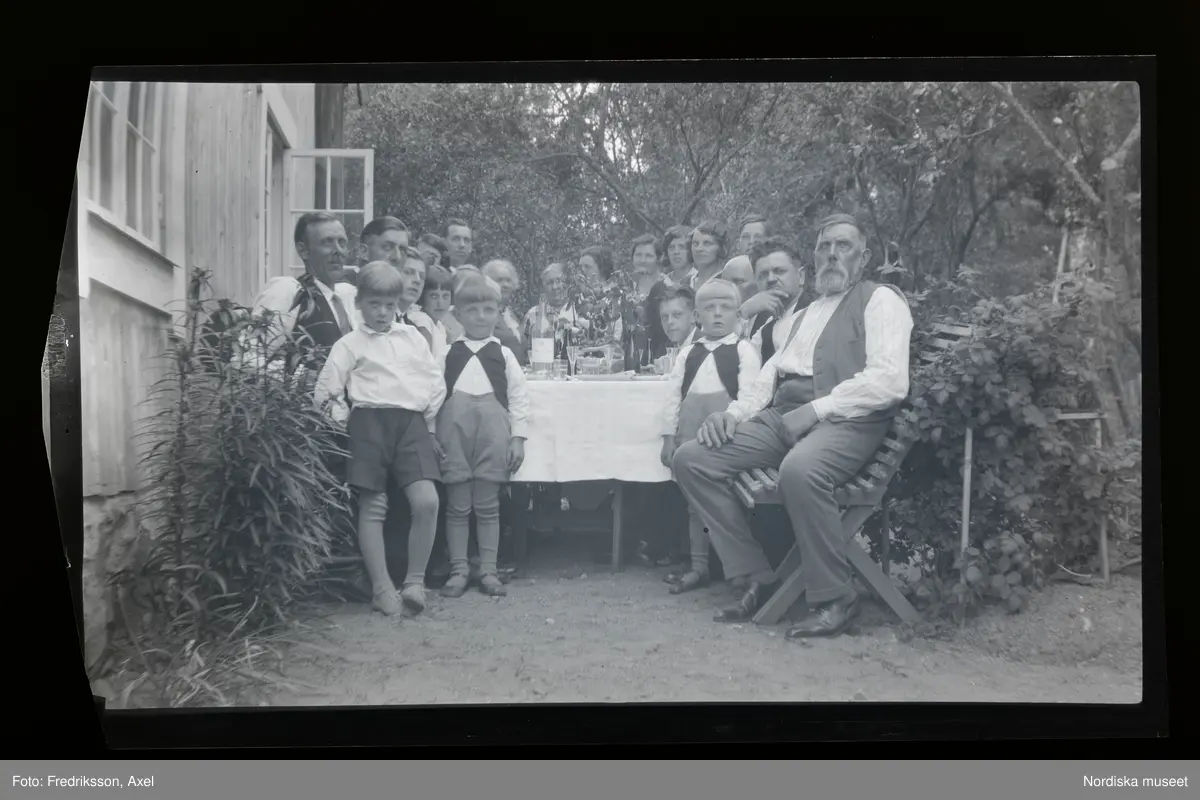 Ett sällskap med vuxna och barn samlade kring ett bord i en trädgård. På bordet står en flaska och snaps-glas.