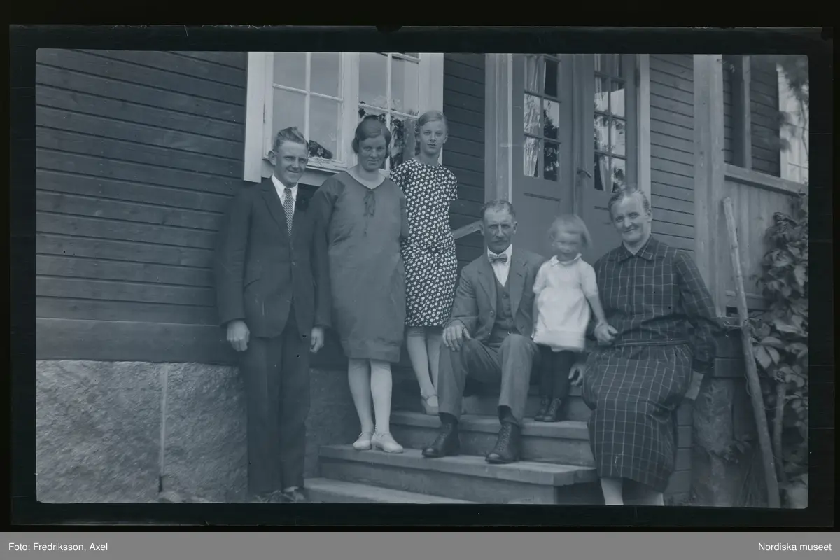 Grupporträtt. Kvinnor, män och barn poserar på trappan till ett hus.