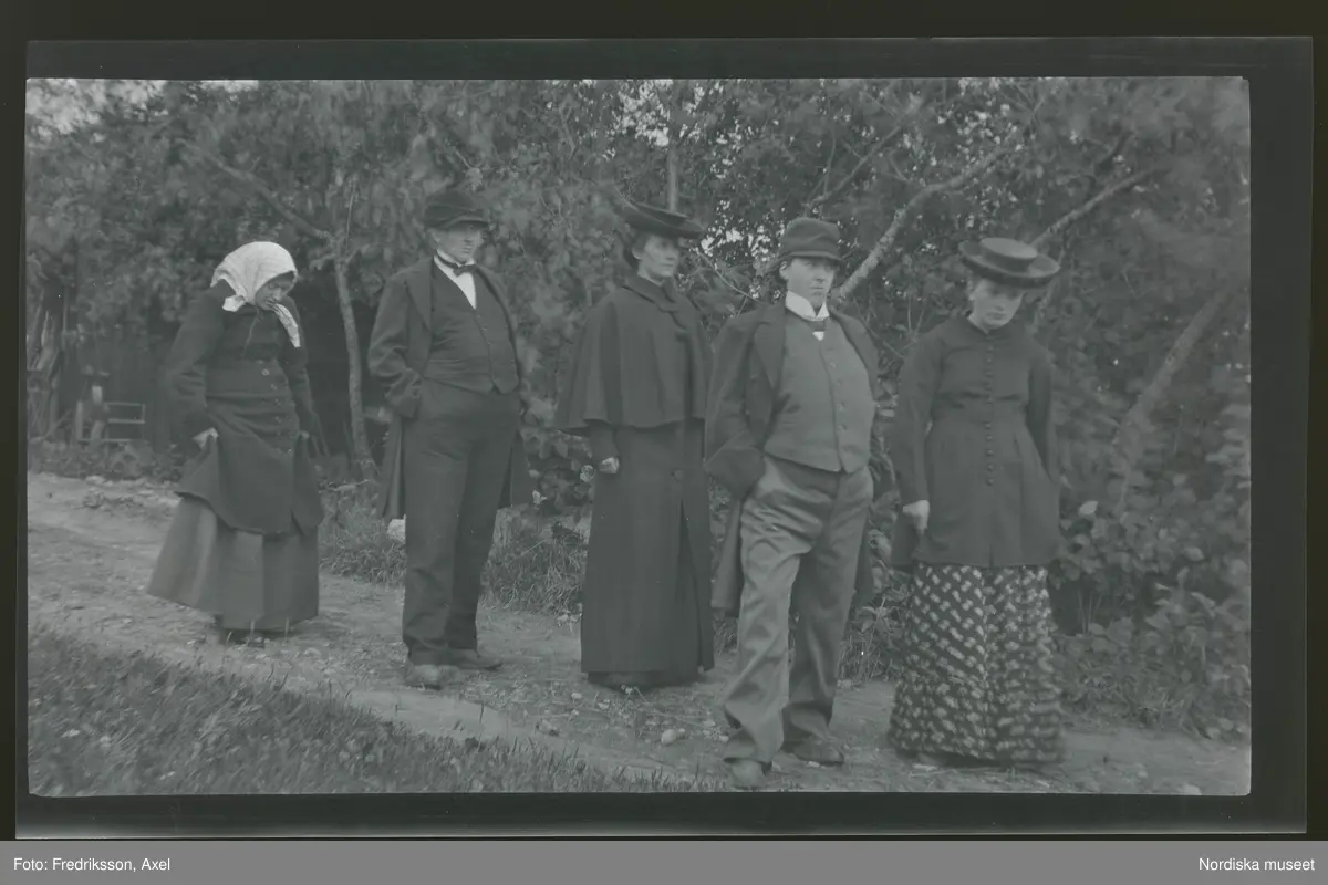 Två kvinnor klädda i herrkläder, tre andra klädda i äldre tiders klänningar på promenad.